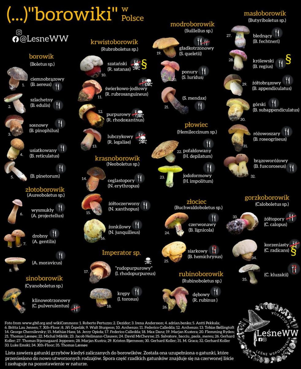 Infografika uwzględnia zmiany w klasyfikacji – wiele gatunków dawniej zaliczanych do rodzaju Boletus zostało przeniesionych do nowych rodzajów na podstawie badań genetycznych. Dzięki temu materiał edukacyjny jest aktualny i zgodny z nowoczesną wiedzą naukową.
